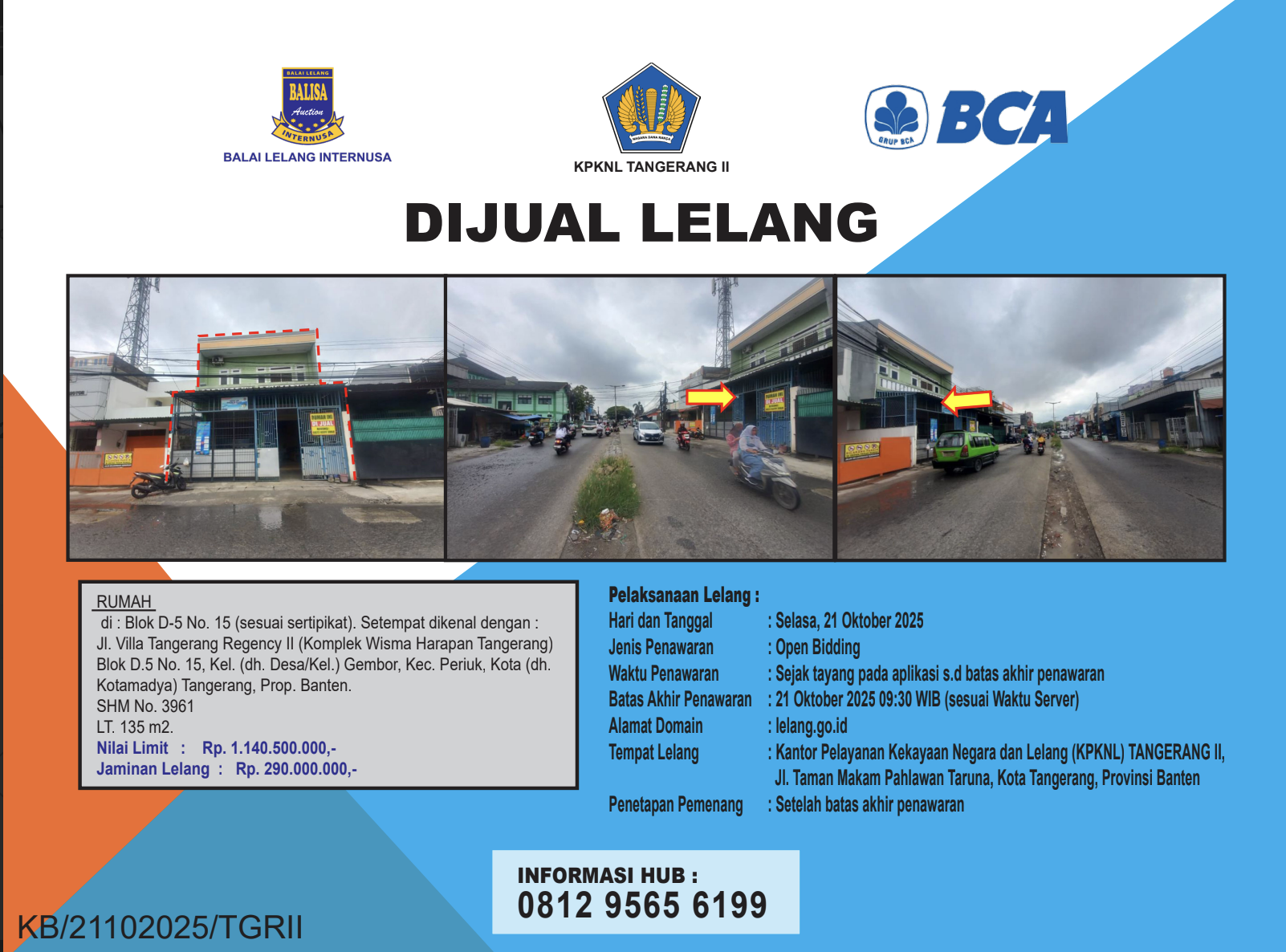 Sebidang tanah seluas 135 m2 sesuai SHM No. 3961/Gembor, berikut bangunan Rumah Tinggal dan segala sesuatu yang melekat diatasnya, yang terletak di : Blok D-5 No. 15 (sesuai sertipikat). Setempat dikenal dengan : Jl. Villa Tangerang Regency II (Komplek Wisma Harapan Tangerang) Blok D.5 No. 15, Kel. (dh. Desa/Kel.) Gembor, Kec. Periuk, Kota (dh. Kotamadya) Tangerang, Prop. Banten.