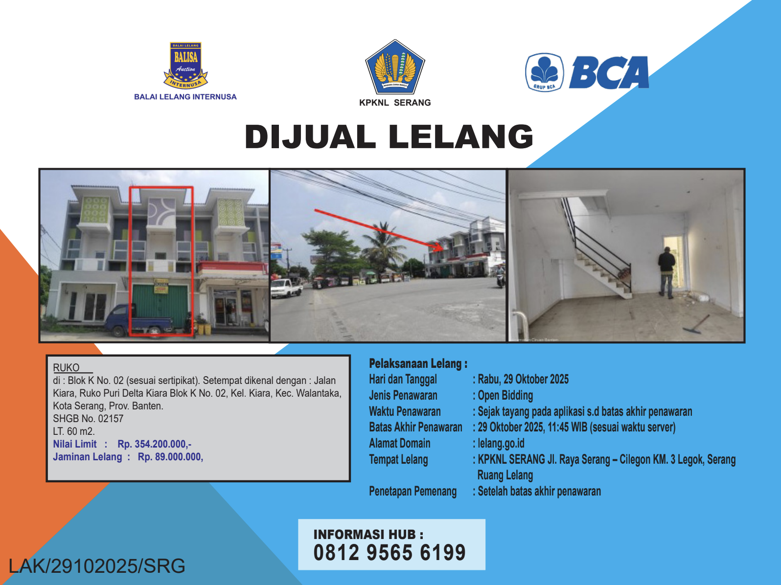 Sebidang tanah seluas 60 m2 sesuai SHGB No. 02157/Kiara, berikut bangunan (Ruko) dan segala sesuatu yang berdiri dan melekat diatasnya, yang terletak di : Blok K No. 02 (sesuai sertipikat). Setempat dikenal dengan : Jalan Kiara, Ruko Puri Delta Kiara Blok K No. 02, Kel. Kiara, Kec. Walantaka, Kota Serang, Prov. Banten.