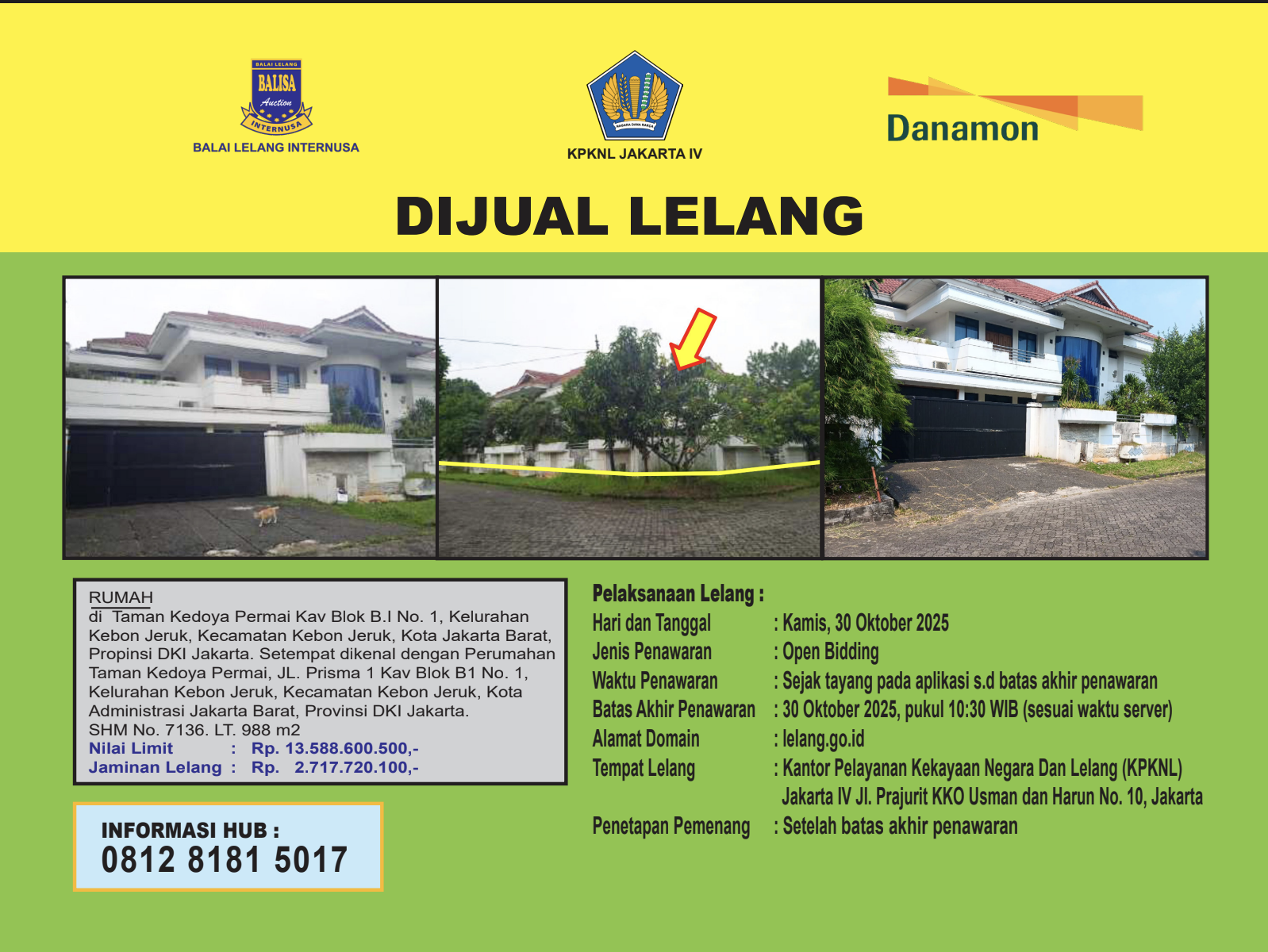 Sebidang tanah seluas 988 m2 berikut bangunan dan segala sesuatu yang berdiri diatasnya. SHM. Setempat dikenal dengan Perumahan Taman Kedoya Permai, JL. Prisma 1 Kav Blok B1 No. 1, Kelurahan Kebon Jeruk, Kecamatan Kebon Jeruk, Kota Administrasi Jakarta Barat, Provinsi DKI Jakarta.