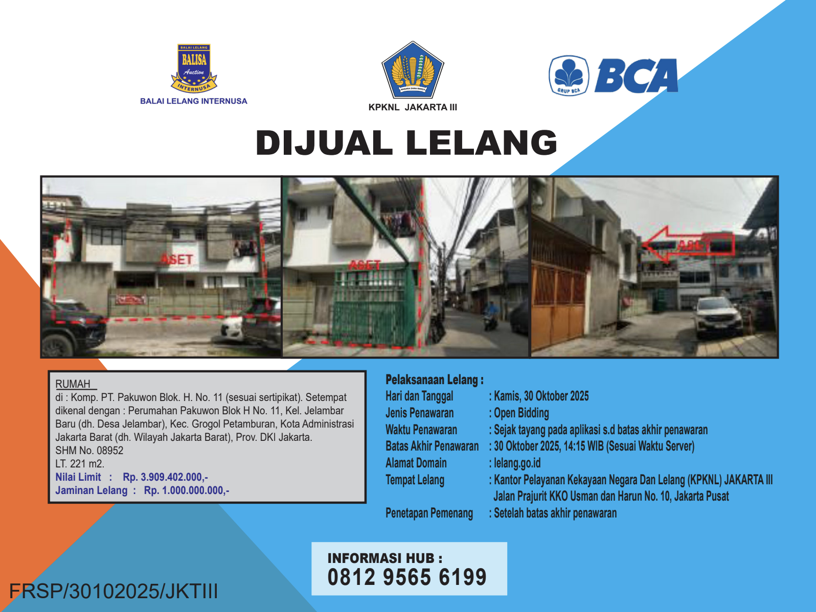 Sebidang tanah seluas 221 m2 sesuai SHM No. 08952, berikut bangunan (Rumah Tinggal) yang berdiri diatasnya, yang terletak di : Komp. P.T. Pakuwon Blok. H. No. 11 (sesuai sertipikat). Setempat dikenal dengan : Perumahan Pakuwon Blok H No. 11, Kel. Jelambar Baru (dh. Desa Jelambar), Kec. Grogol Petamburan, Kota Administrasi Jakarta Barat (dh. Wilayah Jakarta Barat), Prov. DKI Jakarta.