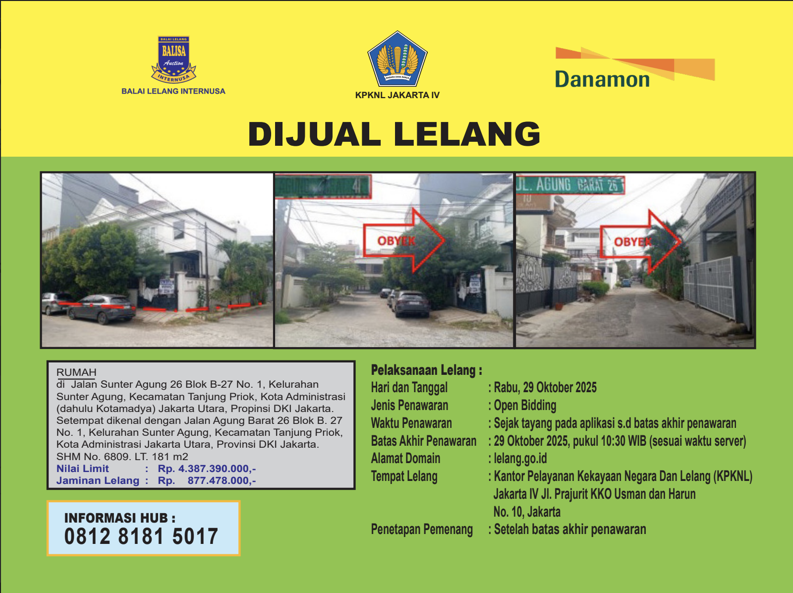 Sebidang tanah seluas 181 m2 berikut bangunan dan segala sesuatu ya berdiri diatasnya. SHM. Setempat dikenal dengan jalan Agung Barat 26 Blok B. 27 No. 1, Kelurahan Sunter Agung, Kecamatan Tanjung Priok, Kota Administrasi Jakarta Utara, provinsi DKI Jakarta