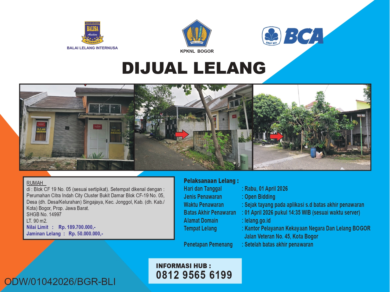 Sebidang tanah luas 90 m2 sesuai SHGB No. 14997/Singajaya, berikut bangunan (Rumah Tinggal) yang berdiri dan melekat diatasnya, yang terletak di : Blok CF 19 No. 05 (sesuai sertipikat). Setempat dikenal dengan : Perumahan Citra Indah City Cluster Bukit Damar Blok CF-19 No. 05, Desa (dh. Desa/Kelurahan) Singajaya, Kecamatan Jonggol, Kabupaten (dh. Kab./Kota) Bogor, Provinsi Jawa Barat.